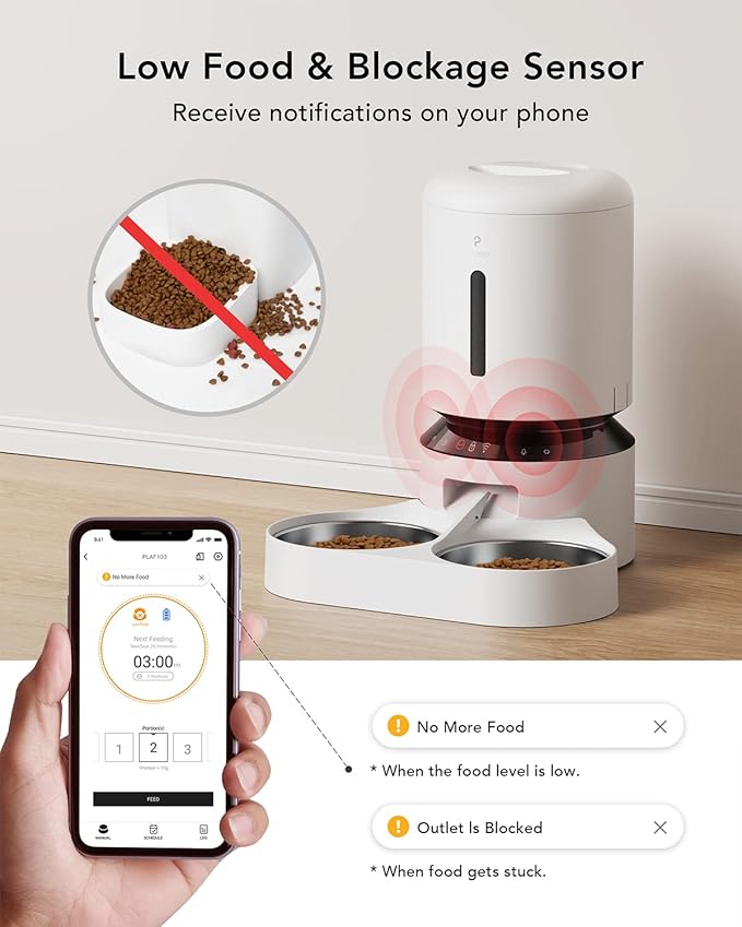 • Smart Notifications and Indicators: Your phone receives notifications and the machine’s indicators also lights up red when the food tank is empty, food gets jammed, the battery is low, or has other problems. The infrared sensor keeps checking and stops food dispensing if the food outlet is blocked.