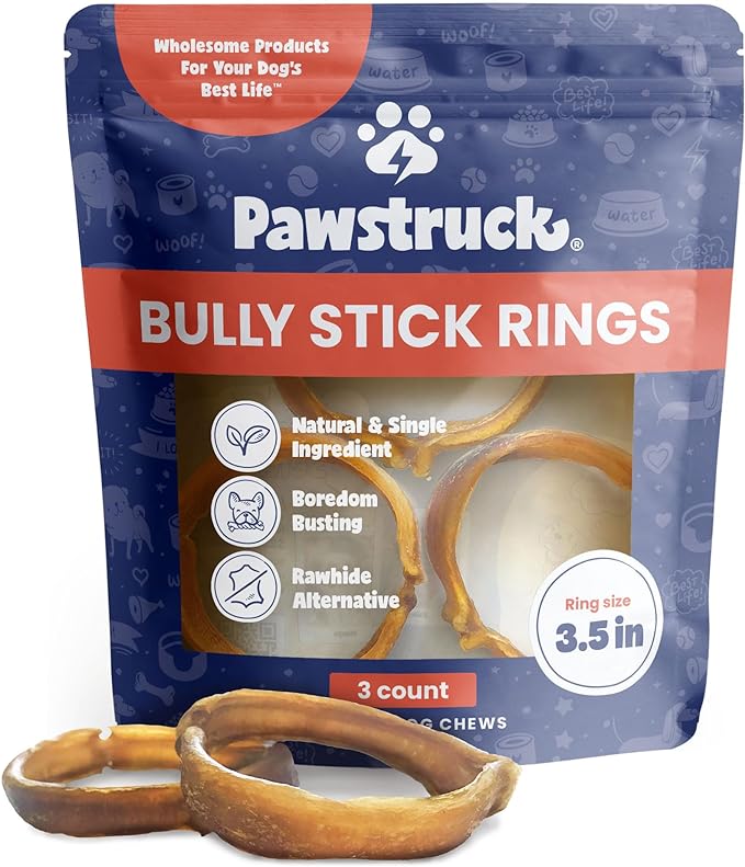 Pawstruck Natural 3.5" Bully Stick Rings for Dogs - Rawhide Free 100% Beef Single Ingredient Dental Chew Treat Bones - Fully Digestible Low Odor - 3 Pack - Packaging May Vary