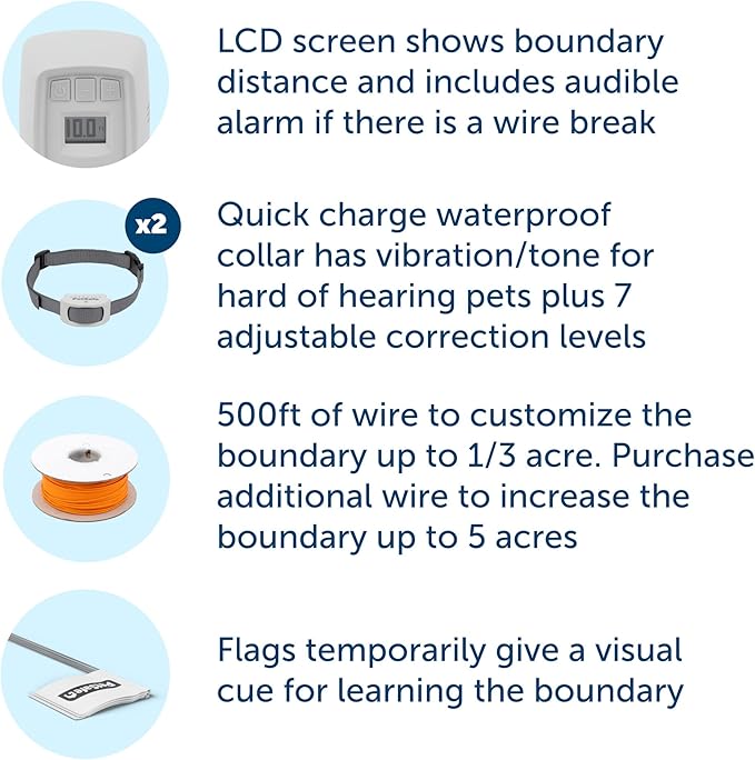 • EXPANDABLE UP TO 5 ACRES: Comes with 500 ft of wire to fence in a 1/3-acre yard, but if you purchase more wire you can contain up to a 5-acre play area
