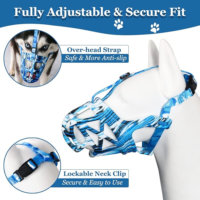 • Creative Printed Cage Muzzle: Made of Non-toxic rubber, our printed cage dog muzzle is tough enough to resist abrasion, yet it is soft and pliable to protect your dog’s nose from rubbing. The attractive and personalized color design can make your dog become the most handsome presence among friends.