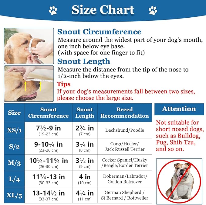 • Notice & Warranty: To fit your dog better, please measure before buying. When you receive your silicone muzzle, make sure that it is large enough to allow your dog to pant and that it is secure. It is recommended to use treats to do positive training and repeat it until your dog gets used to wearing this breathable muzzle. We offer 60 days money-back guarantee and are happy to take returns on muzzles that are in like-new condition. Just buy with confidence!