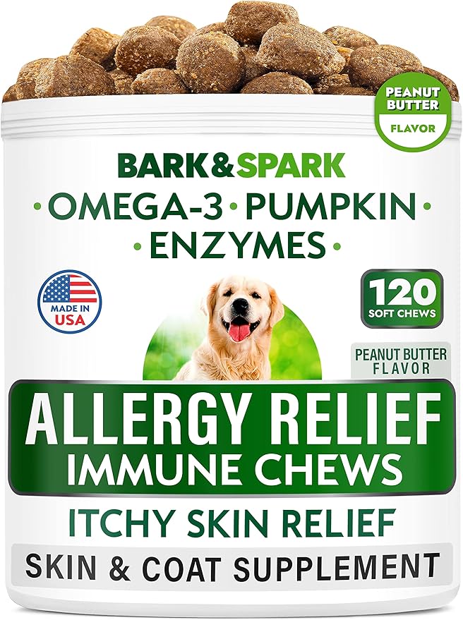 BARK&SPARK Dog Allergy Relief Chews - Anti-Itch Skin & Coat Supplement - Omega 3 Fish Oil - Itchy Skin Relief Treatment Pills - Itching &Paw Licking - Dry Skin&Hot Spots - (120 Immune Treats - Peanut)