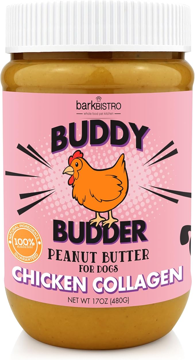 BUDDY BUDDER Bark Bistro Company, Chicken Collagen, 100% Natural Peanut Butter, Healthy Peanut Butter Dog Treats, Stuff in Toy, Dog Pill Pocket, Made in USA (17oz jars)