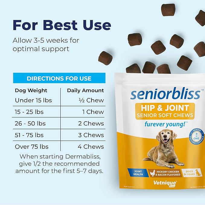• POWERFUL MOBILITY SUPPORT - Seniorbliss Hip & Joint senior dog supplement specifically created for older dogs (7yrs+). With Glucosamine for dogs, Chondroitin, & MSM to support inflammatory response, joint lubrication, & pain caused by mobility issues.