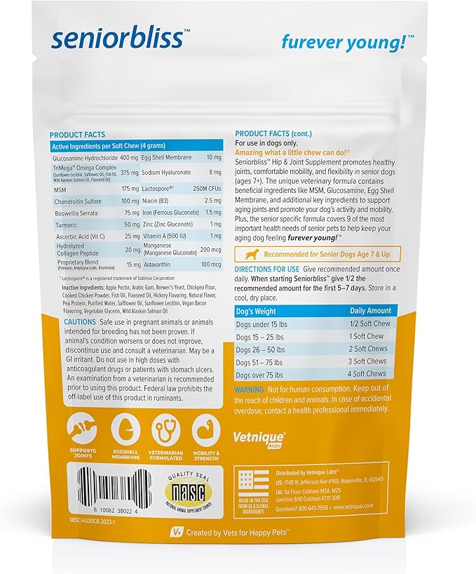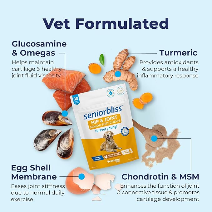 Vetnique Seniorbliss Senior Dog Joint Supplement with Glucosamine and Chondroitin for Dogs Joint Support and Healthy Cartilage Development - for Small & Large Breeds (Hip & Joint Chew, 30ct)