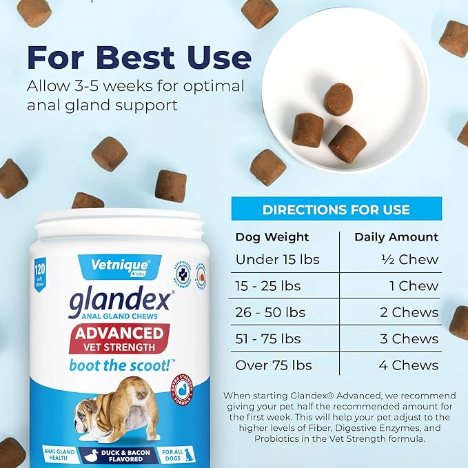 • RESULTS IN 3-5 WEEKS: Glandex Advanced Vet Strength dog fiber supplements will help your pet to "Boot the Scoot", providing a better alternative to regular anal gland expressions for dogs with chronic anal gland problems.