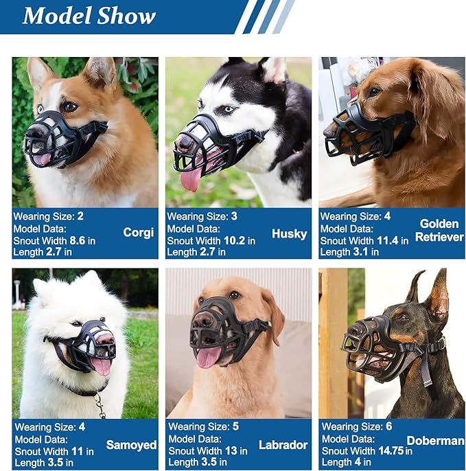 • SAFETY BASKET MUZZLE Basket dog mouth cover design gives all-around snout protection, prevents biting, chewing, licking, scavenging, and perfectly solve the problem that traditional muzzle can’t let dogs drink and being feed. Well used for safe public socialization, safe handling during vet visits, grooming or dog traveling.