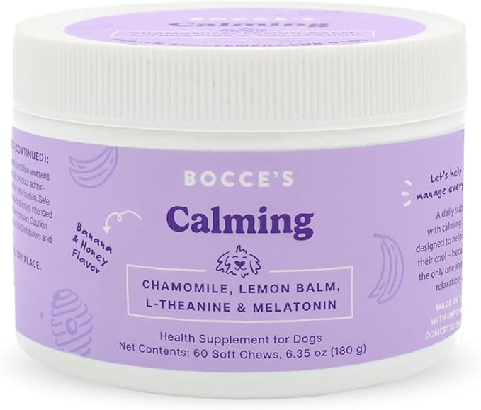 Bocce's Bakery Calming Supplement for Dogs, Daily Chews Made in The USA with Chamomile, Lemon Balm, L-Theanine & Melatonin, Supports Stress, Peanut Butter & Honey, 60 ct