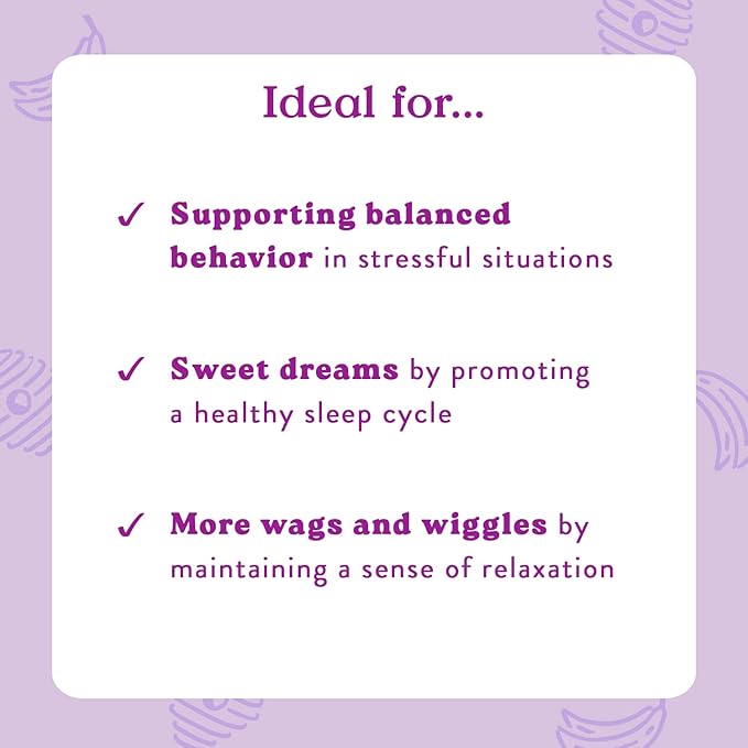 • Let’s help your pup manage everyday stress. A daily health supplement with natural, calming ingredients designed to help your doggy keep their cool - because you're not the only one in need of a little relaxation and TLC.