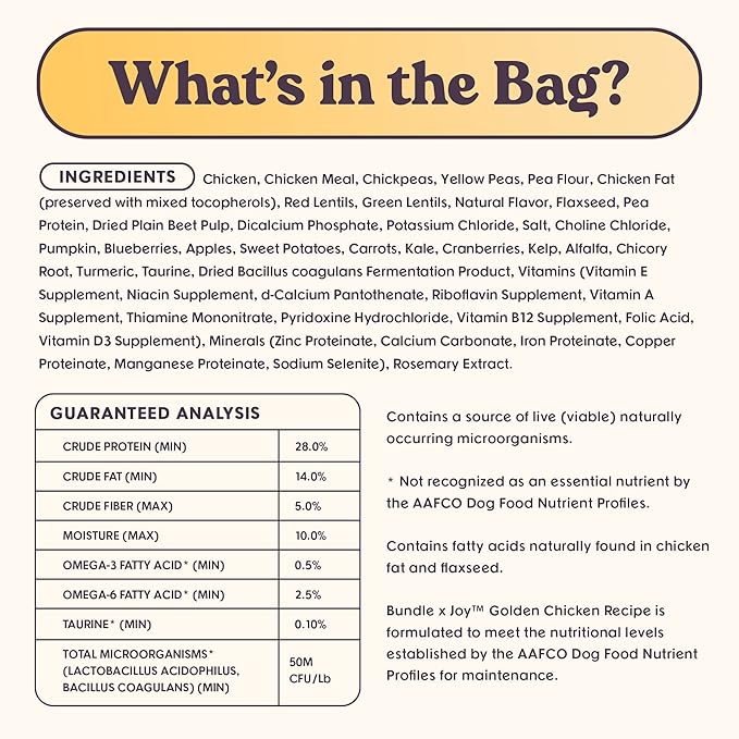 • FOR ALL ADULT BREEDS AND SIZES: Bundle x Joy dog food has omega fatty acids to support healthy skin and a shiny coat and probiotics to support digestion. The kibble pieces are small enough for small breed dogs to enjoy.