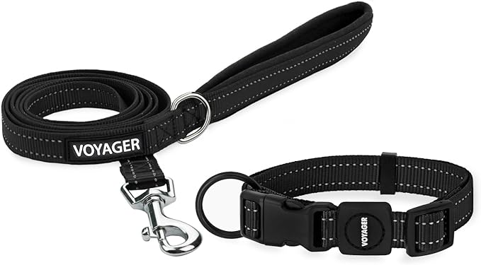 Voyager Reflective Dog Leash Collar Set with Neoprene Handle Supports Small, Medium, and Large Breed Puppies, Cute and Heavy Duty for Walking, Running, and Training - Black, L