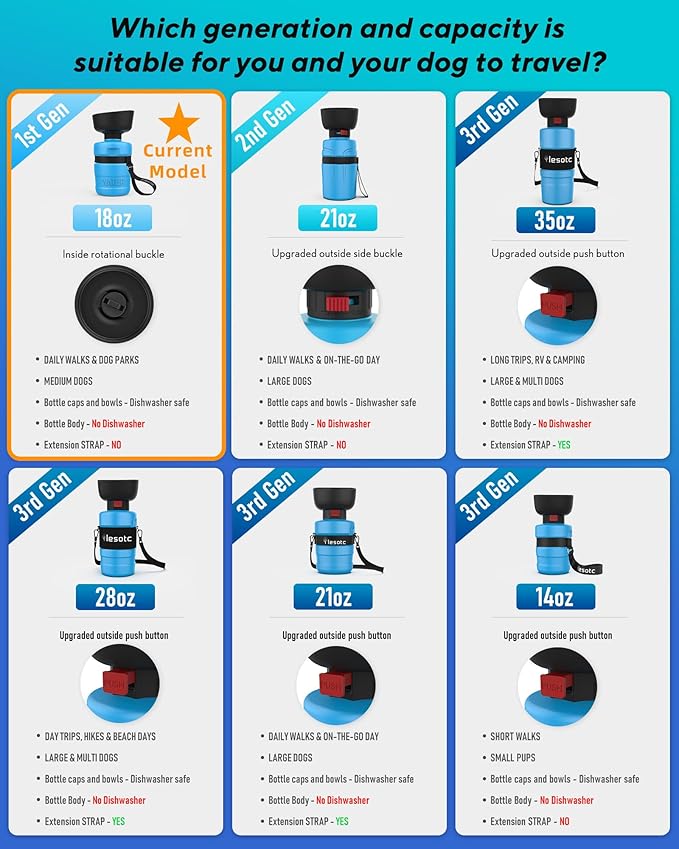 • It's Easy to Use: With lesotc exclusive patented design, the U2mug dog water bottle is a two-in-one solution that combines a water bottle and bowl. The foldable cap doubles as a drinking bowl, so you no longer need an external bowl to give your furry friend water to drink. Simply press the portable dog water bottle with one hand, and water will flow into the bowl. Fold the dog cup back after your dog has finished drinking. It's that simple.