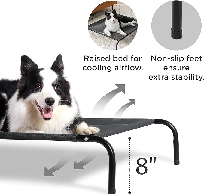 • Indoor & Outdoor Use: Weather resistant, the 8" raised breathable mesh cot works great indoors and outside. Keep your pup dry and comfortable in the backyard, on the patio or porch, next to the pool, or while camping.