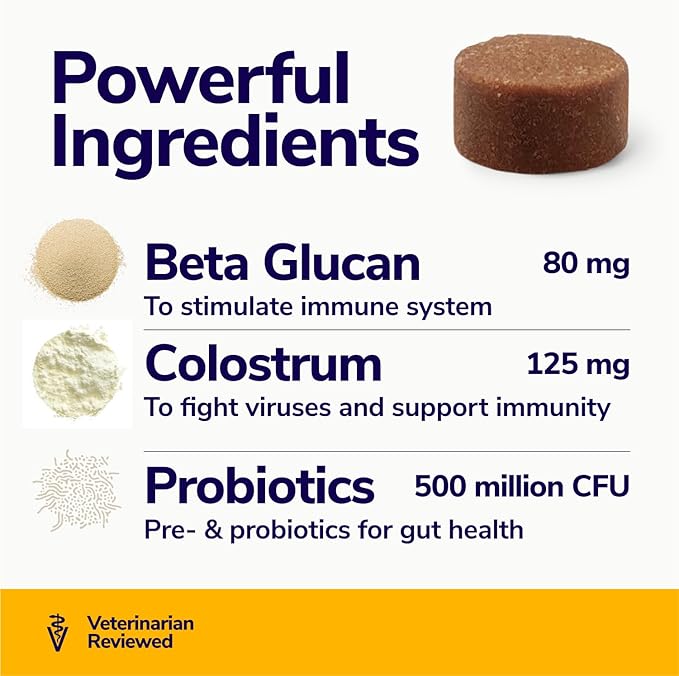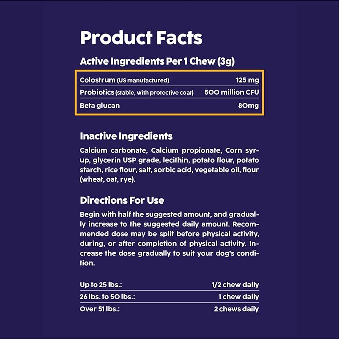 • DOG ITCH RELIEF & ALLERGY SUPPORT - Miracle Vet dog allergy soft chews are packed with dog vitamins, colostrum, and beta-glucan to support allergy relief for dogs itching and promote healthy skin and coat. These allergy probiotic chews for dogs itching and licking paws support dogs against allergies and itching. Give your pet the best dog vitamins and supplements with our dog probiotics for itchy skin and allergy dog chews, and watch them thrive with improved gut health and immune support dog items