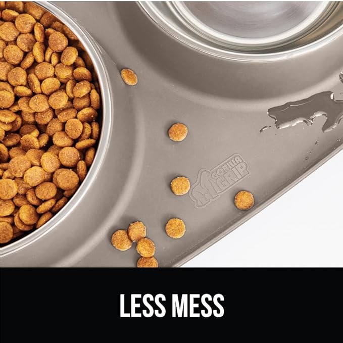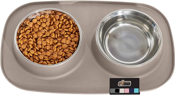 Gorilla Grip 100% Waterproof BPA Free Cat and Dog Bowls Silicone Feeding Mat Set, Stainless Steel Bowl Slip Resistant Raised Edges, Catch Water, Food Mess, No Spills, Pet Accessories, 2 Cup, Beige