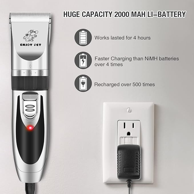 • đŸ±ă€High Capacity Battery】Equipped with a built-in 2000mAh lithium battery, our dog hair clippers can work continuously for 3-4 hours after a full charge of only 3 hours. With a long battery life and the ability to be recharged over 500 times, the cordless dog hair trimmer offer convenience and flexibility. You can groom your pet anytime and anywhere, without being restricted by cords.