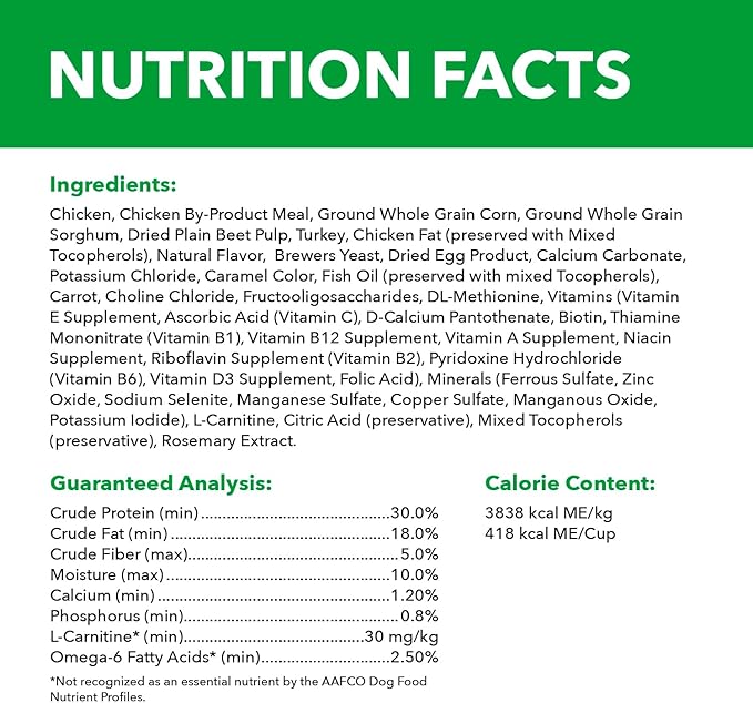 • SUSTAINED ENERGY: 30% protein, 18% fat, and a blend of wholesome grains for sustained energy and optimal body condition.