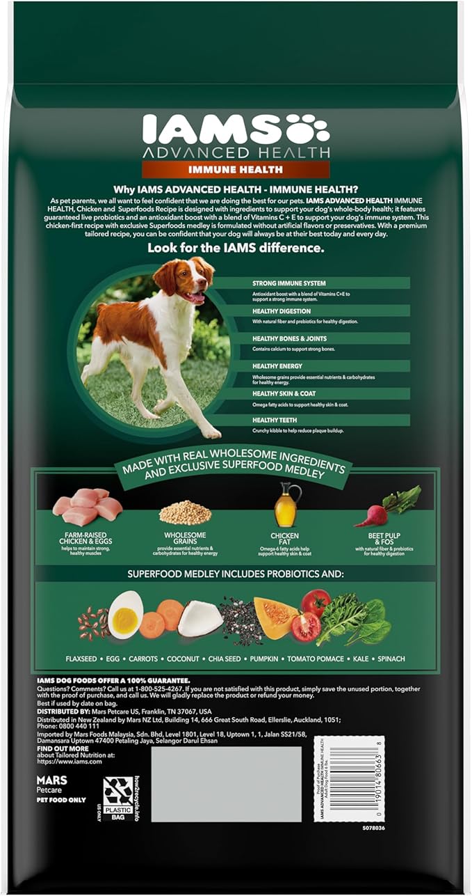 • 6 lb. Bag: Contains one (1) 6 lb. bag of IAMS Advanced Health Immune Health Adult Dry Dog Food Chicken & Exclusive Superfoods Medley Recipe.