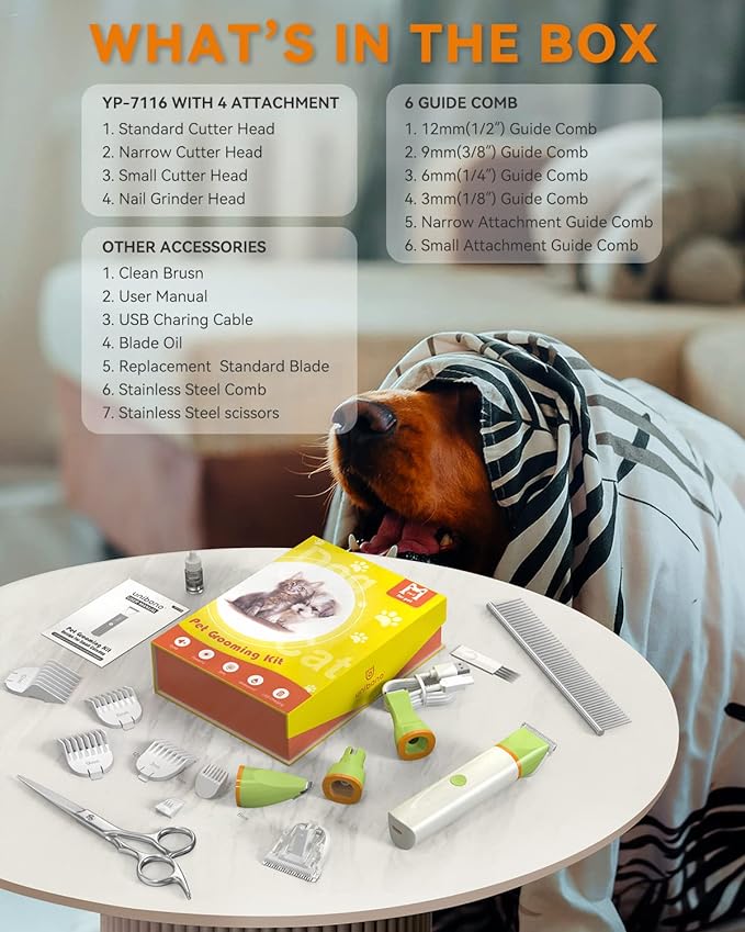 • 4 in 1 Design with Stainless Steel Scissors and Comb: The 7116 dog grooming clippers adopts a detachable cutter head design with 4 replaceable cutter head attachments — standard cutter head,narrow cutter head,small(details) cutter head and nail grinder head, which can be quickly replaced with just one pull and one push to meet the needs of dog body trimming, especially suitable for puppies.