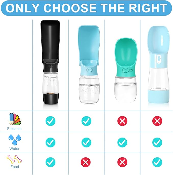• ✅2 in 1 PORTABLE DESIGN: Our portable dog water bottle with food container not only to hold water, but also to carry food, which can hold 11oz water and 200g food, perfect for your pet's need for water and food with bowl . 180 degree folding design, compact, lightweight and portable making it easy to take your pet on the go.