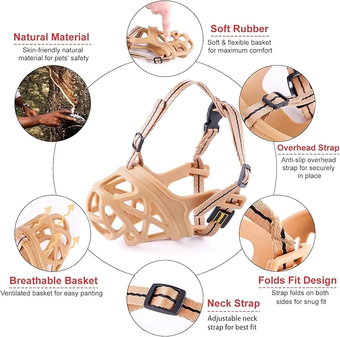 • Tough yet Soft: Made of a pliable Non-toxic rubber, The Basket Muzzle is extremely tough, durable, and soft to touch, and it can be widened or narrowed if needed.