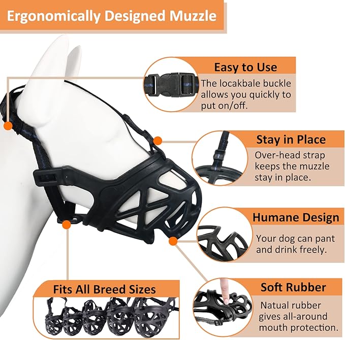 • The Only Muzzle You Need - Say goodbye to your old muzzles. The BARKLESS practical muzzle has features you need to prevent your dog from nipping, destroying, fighting and digging and eating everything while the basket-style design gives all-around mouth protection allowing your pet unrestricted drinking and panting. Best muzzles make it the ideal choice for reactive dogs’ daily walks, occasional use, dog park socialization, grooming, vet visits, training, traveling, and walking.