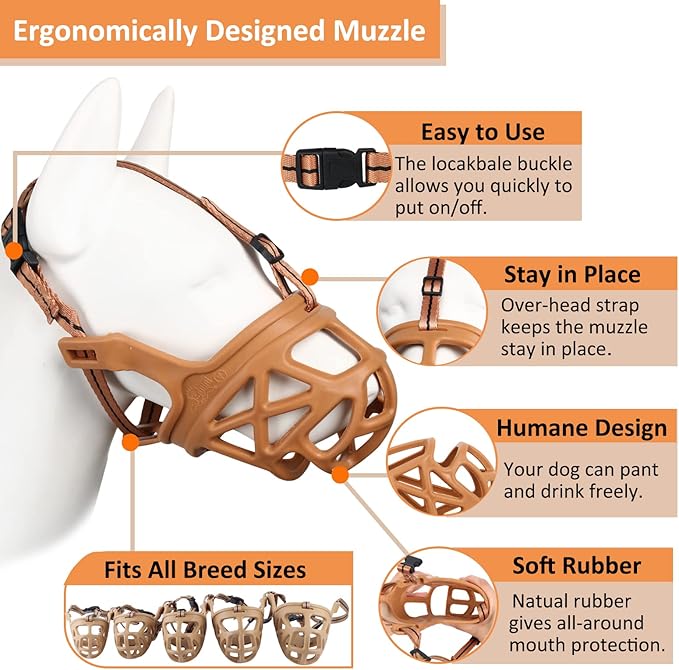 • The Only Muzzle You Need - Say goodbye to your old muzzles. The BARKLESS practical muzzle has features you need to prevent your dog from nipping, destroying, fighting and digging and eating everything while the basket-style design gives all-around mouth protection allowing your pet unrestricted drinking and panting. Best muzzles make it the ideal choice for reactive dogs’ daily walks, occasional use, dog park socialization, grooming, vet visits, training, traveling, and walking.