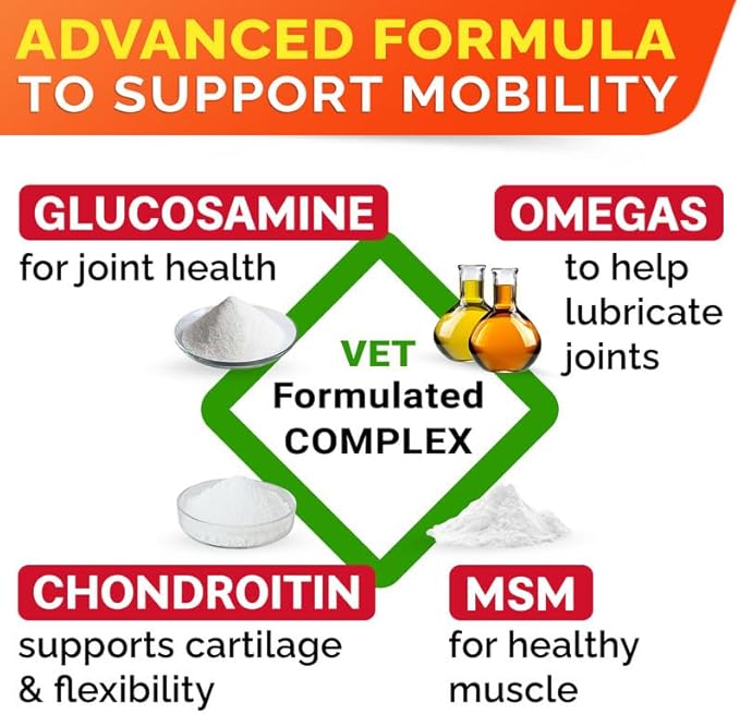 • Enhanced Senior Formula: This joint supplement for dogs is perfect for seniors, offering increased glucosamine and hyaluronic acid to promote your pet's active lifestyle and smooth movements. Our formula is a top choice among senior dog supplements.
