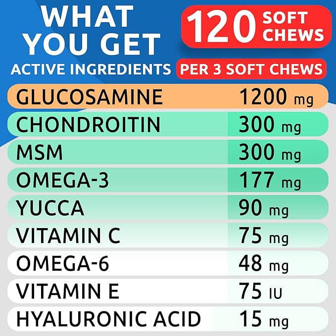 • Trusted Relief: Our vet-approved glucosamine for dogs comes with a 90-day guarantee and easy refund, delivering the strength and care your older pet's joints need. Let them leap with joy again. Join millions of happy tails today.