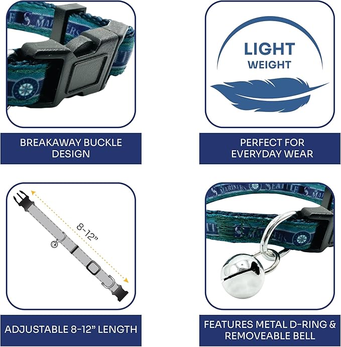 MLB CAT Collar Seattle Mariners Satin Cat Collar Baseball Team Collar for Dogs & Cats. A Shiny & Colorful Cat Collar with Ringing Bell Pendant