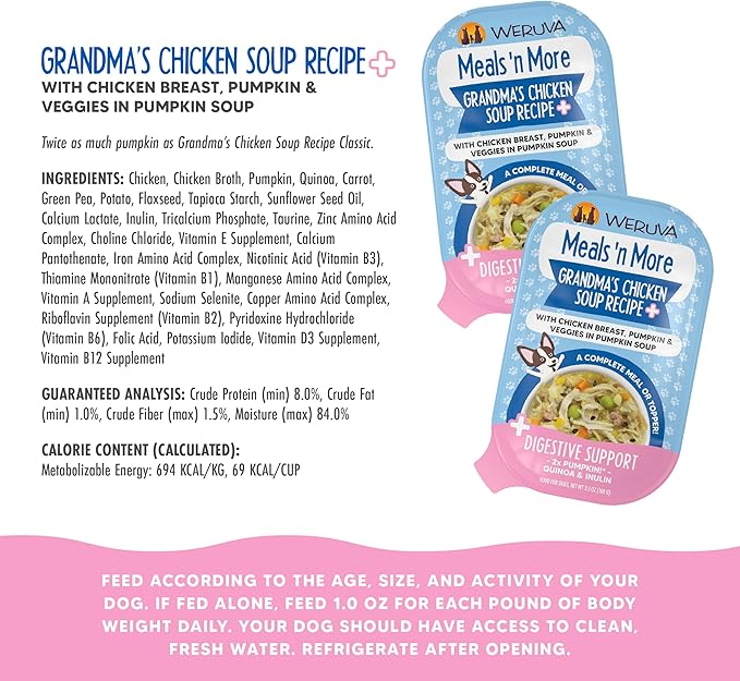 Weruva Meals 'n More Natural Wet Dog Food, Grandma's Chicken Soup Plus Digestive Support, 3.5oz Cup (Pack of 12)