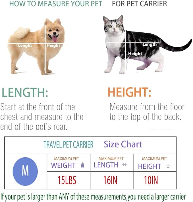 • BOTH SIZES & WEIGHTS: 17"L x 11"W x 11"H, suitable for cats and dogs up to 15 lbs. Please do not choose your pet carrier based on weight--please reference your pet's length and height in selecting a carrier size.