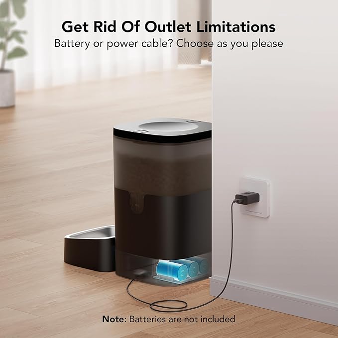 • Dual Power Mode: Use the DC 5V adapter to power the auto cat feeder. Alternatively, install three backup alkaline D batteries (not included) for peace of mind during a power outage. (Equipped with setting memory to prevent sudden power failure)