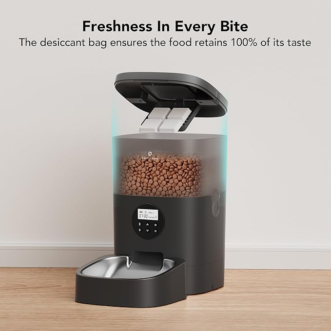 • Freshness in, Cats out: The PETLIBRO automatic pet feeder has a secure top lid that prevents cats from accessing the food and keeps air out to maintain freshness. Search for "B08NVBYQHV" to buy replacement desiccant bags.