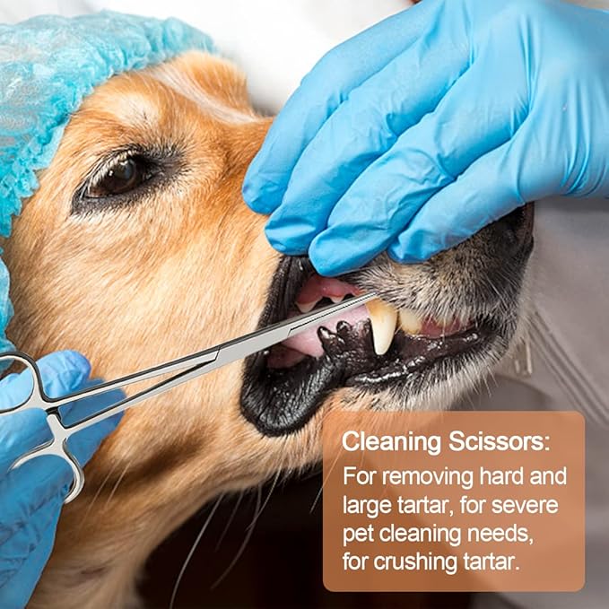 • 1. Comprehensive dog tooth cleaning kit: Made of high-quality stainless steel, safe and reliable, tools to meet various dog tooth cleaning needs, cleaning gloves, cleaning pliers, cleaning scrapers*2, tweezers, probes. Owning it can help you with any pet oral problems