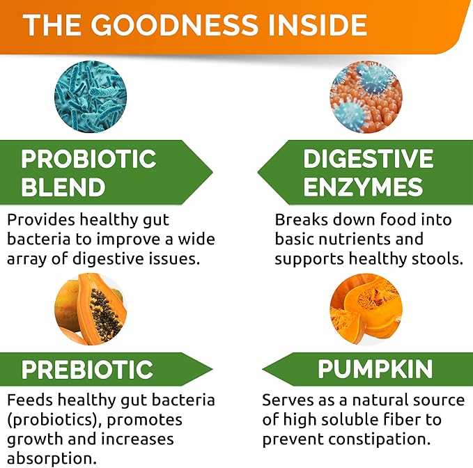 • Vet Strength Probiotic and Pumpkin Powder for Health Tummy - packed with a billion CFU in each serving, in addition to prebiotic, enzymes and fiber rich pumpkin seeds, these digestive chews for dogs help easy various stomach issues like gas, diareah, sensitive or upset stomach, constapation, gas, acid, loose inconsistent stool, bad breath etc.