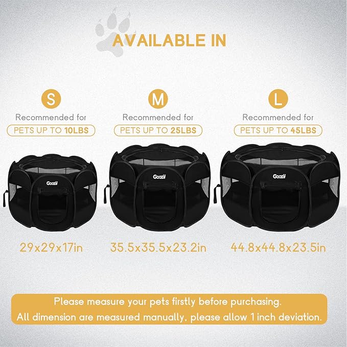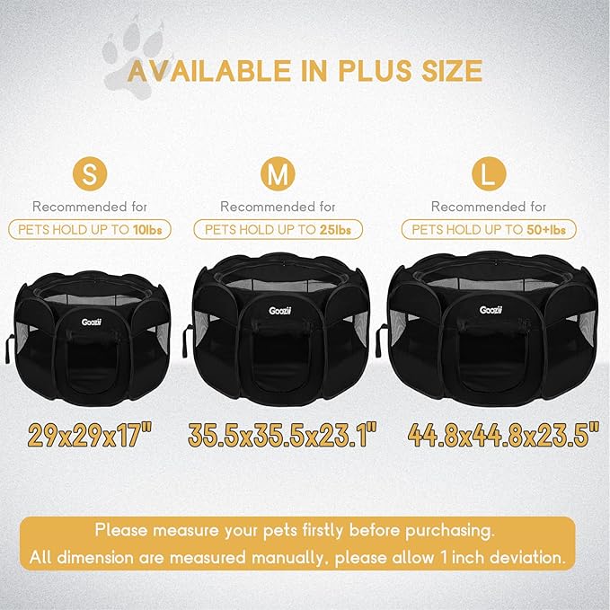 • 【Spacious & Comfort】: This dog playpen keeps your pet stay in this pet playpen secure, spacious interior give more fun for your pet. Size is 44.8*44.8*23.5 inches, great for small pets up to 50 LB. There are 1 inch error range because of technical issue.