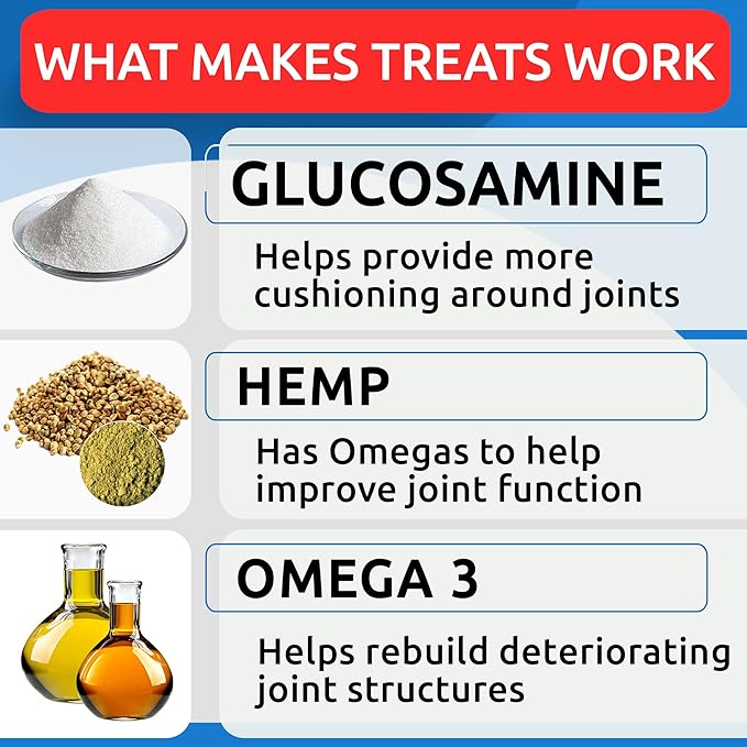 • Potent Formula: Our chews are loaded with active ingredients like glucosamine chondroitin for dogs and MSM to improve mobility and reduce joint inflammation. Plus, hemp for dogs for powerful pain relief.