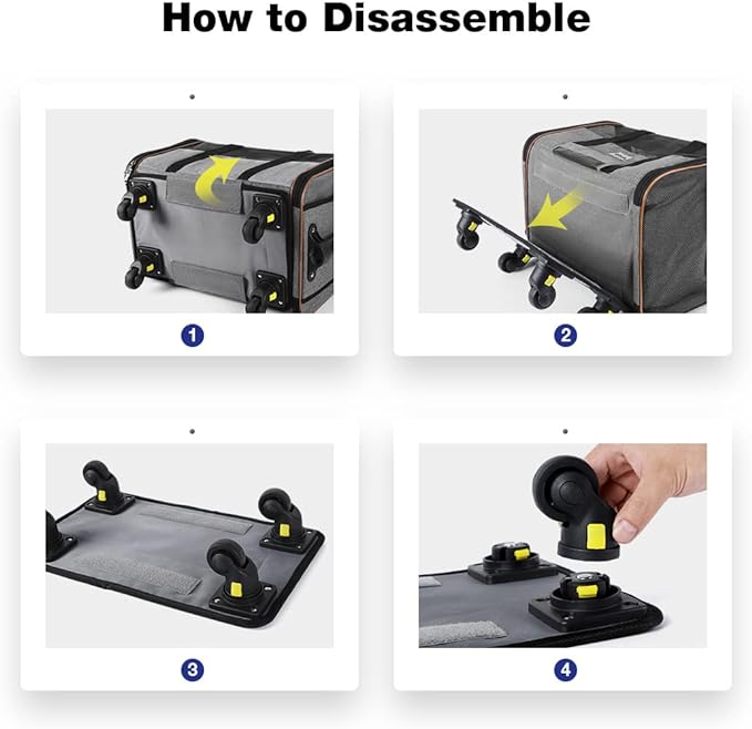 • Pet Carrier with Wheels: A removable platform with 4 wheels and a telescopic handle make it convenient for travelers walking through airports. The rolling cat carrier also features a carrying strap and adjustable shoulder strap for easy pulling and pushing. Platform is securely attached with high grade velcro while the wheels are easy to assemble or disassemble.