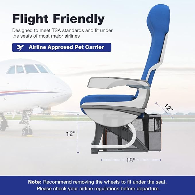 • Pet Carrier Airline Approved: Designed to meet TSA standards, this dog carrier fits under the seat of most airlines when the wheels are removed. Pet carrier size: 18''L x 12''W x 12"H (without wheels). Recommend for pets up to 20lbs.