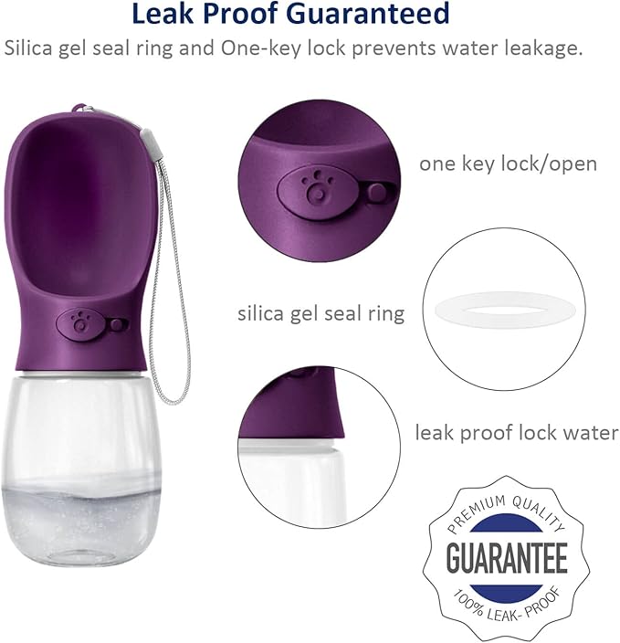 • [Color & Size]: Violet. The water bottle could hold max 12 fl oz (350ml) of water and the food can could hold 6 fl oz (about 100g) food. This choice would be suitable for small and medium dogs, or if you wanna take your puppy for a long walk like hiking or traveling.