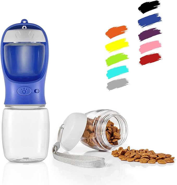 • [Convenient to Carry]: 2 In 1 Portable design, not only to hold water, but also can carry food. Enough capacity and compact water bottle design is great for your pet dog or cat when outdoor walking, running, hiking, traveling or playing, etc. You can put it into backpack or hang on your hand with sling rope, very easy to carry to anywhere you want.