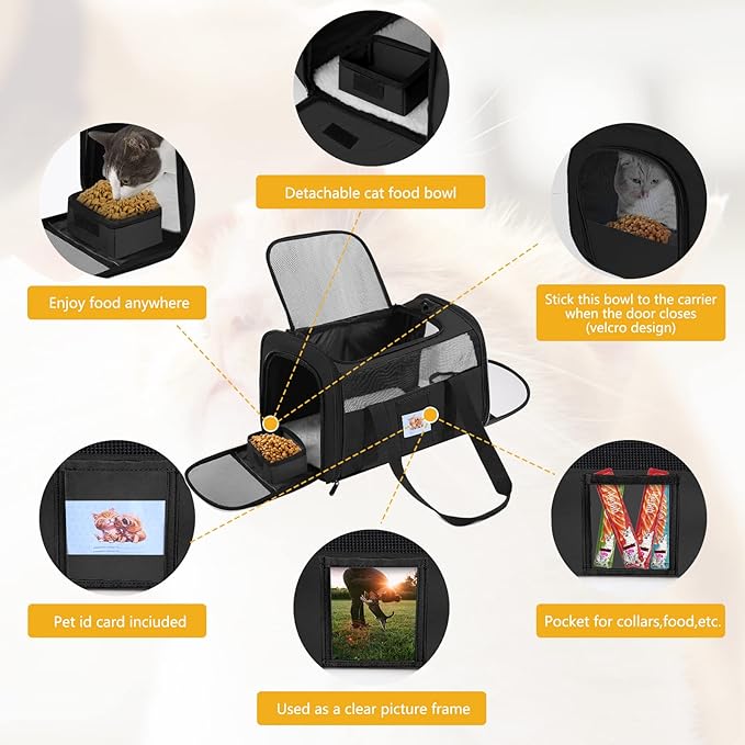 • ✈[Airline Approved] Our cat carrier fits comfortably under most filght seats, like Southwest Airlines, American Airlines, Delta Airlines, Alaska Airlines, Jetblue,Frontier and so on. Also, it is perfect for car ride and vet ride.