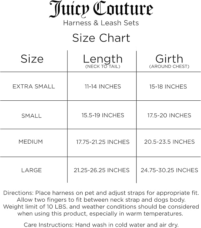 • π„π€π’π˜ π“πŽ 𝐔𝐒𝐄 – The Juicy Couture puppy harness and leash set is simple to use. First put the vest on their pet and tighten it, allowing two fingers to fit between the neck strap and the dog's body. Second, snap the buckle and get the length you want. That's it!