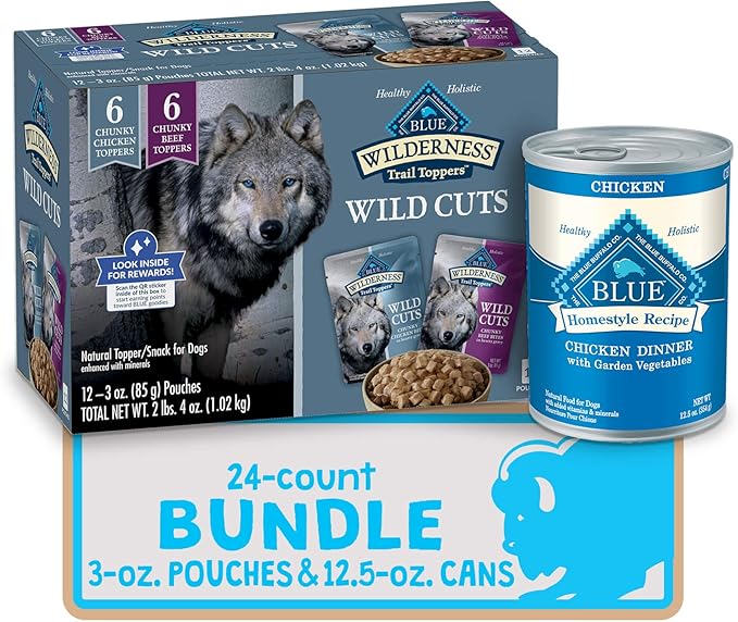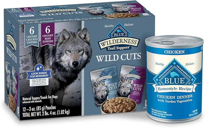 • FEED THREE WAYS: BLUE Homestyle Recipe adult dog food makes a delicious treat, adds interest mixed into their favorite dry foods or can be fed as a meal on its own