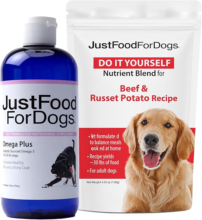JustFoodForDogsDIY Human Quality Dog Food,Grain Free Nutrient Blend Base Mix for Dogs-Beef and Russet Potato Recipe (129 Grams) & Omega Plus Fish Oil for Dogs-Omega 3 Liquid Supplement for Pets-16 oz