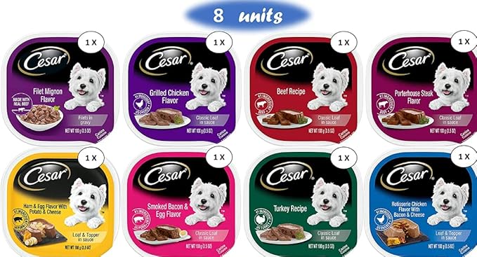 • Contains 08 count case of 3.5 oz. trays of CESAR Wet Dog Food Classic Loaf in Sauce ,Flavors Variety Pack: (01) Beef Recipe, (01) Filet Mignon Flavor, (01) Grilled Chicken Flavor, (01) Porterhouse Steak Flavor, (1) Ham &Egg with Potato & Cheese, (1) Smoked Bacon.(1) Turkey Recipe, (1) Rotisserie Chicken