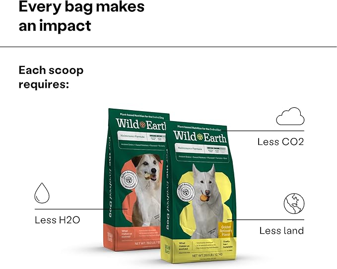 • SUSTAINABLY SOURCED: With every bag of Wild Earth, you help reduce the impact of the pet food industry. Our food requires less water and emits less CO2 than meat-based kibble! Made in the USA with globally sourced ingredients.