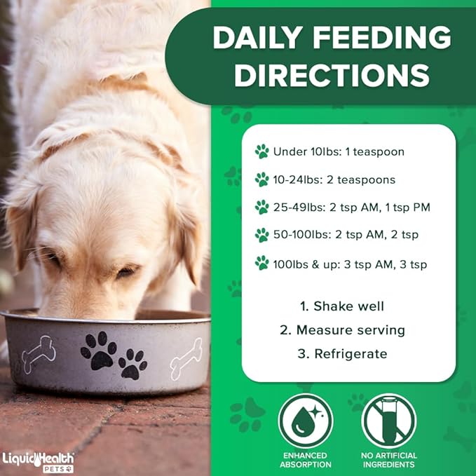 • PERFECT FOR DOGS ALL AGES AND ALL SIZES - Our liquid dog glucosamine hip and joint juice formula is suitable for dogs of all breeds, all ages, and all weights including small dogs and large breeds. Follow the serving size and feeding instructions on our Liquid Health K9 Glucosamine bottle for the best results! We recommend giving your dog their doses of K9 Glucosamine with food or shortly after their meals and refrigerate after use.