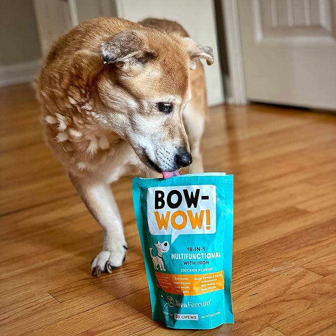 NovaFerrum Bow Wow | 18-in-1 Multifunctional with Iron Supplement for Dogs | Blood Support for Anemia | Glucosamine | Probiotics | Antioxidants | Chicken Flavor | 90 Chews